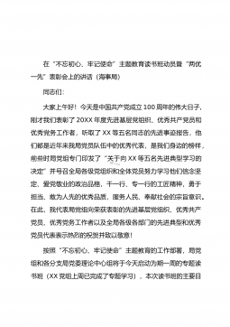 在“不忘初心、牢记使命”主题教育读书班动员暨“两优一先”表彰会上的讲话(海事局)同志们:大家上午好!今天是中国共产党成立100周年的伟大日子,刚才我们表彰了20XX年度先进基层党组织、优秀共产党员和优秀党务工作者,听取了XX等五名同志的先进事迹报告,他们都是近年来我局党员队伍中的优秀代表,是我们身边的榜样,前些时局党组专门印发了“关于向XX等五名先进典型学习的决定”并号召全局各级党组织和全体党员努力学习他们信念坚定、爱党敬业的政治品格,干一行、专一行的工匠精神,勇于担当、敢为人先的优秀品质,服务人民、奉献社会的宗旨意识。在此,我代表局党组向荣获表彰的先进基层党组织、优秀共产党员、优秀党务工作者...