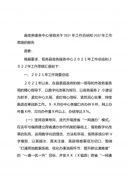 县政务服务中心党组关于2021年工作总结和2022年工作思路的报告县委:根据要求,现将县政务服务中心2021年工作总结和2022年工作思路汇报如下:一、2021年工作简要总结2021年以来,在县委县政府的统一领导和市政务服务局的精心指导下,以数字化改革为指引,以政务服务2.0建设为抓手,紧扣中心大局,紧盯核心指标,紧抓民心实事,持续推进改革创新工作。X-X月份中心各窗口共办件X件,网上办件量X件,日均办件量X件以上,办结率达X%。(一)坚持效果导向,迭代升级跨省“一网通办”模式。在去年与福鼎建立跨省通办协作机制的基础上,借助数字化改革的东风,运用数字化的理念、方法和手段,按照系统分析V字模型,...