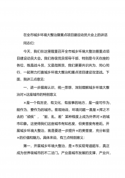 在全市城乡环境大整治暨重点项目建设动员大会上的讲话同志们:今天,我们在这里隆重召开全市城乡环境大整治暨重点项目建设动员大会。我们各级党员领导干部,特别是今天在座的各位,既是战斗员,又是指挥员,我们更要共识共为、同心同行,一起努力打赢城乡环境大整治和重点项目建设攻坚战。下面,我讲三点意见:一、进一步提高认识、统一思想,深刻理解城乡环境大整治对×这座城市的特别意义×是一个有历史、有文化、有故事的地方,是一座可作为、能作为、要作为的城市。客观地说,环境问题一直是×挥之不去的“顽疾”,“脏、乱、差”某种程度上成为外界对×的城市印象。这使得我们这座城市有知名度,但美誉度有差距。开展城乡环境大整治,就是要...