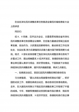 在全区深化民兵调整改革任务推进会暨民兵编组表彰大会上的讲话同志们:经X、X同意,召开这次会议,主要是贯彻落实省市深化民兵调整改革任务部署会议精神,在后备力量建设领域立起改革发展、担当作为、大抓落实的鲜明导向,推动各项工作往深处走、往实处落,努力在建强民兵后备力量方面不断取得更大成效。刚才,X部长安排部署了我区深化民兵调整改革任务和下步重点工作,提出明确要求,X经济开发区,各镇街和各行政企事业单位要认真学习领会,抓好贯彻落实。下面我就下步我区持续深化民兵调整改革,提升民兵编建质量,再讲三点意见。一、抬高政治站位,坚定扛起民兵调整改革的使命担当习主席强调,“要从讲政治高度看待抓落实问题”。抓好国防...