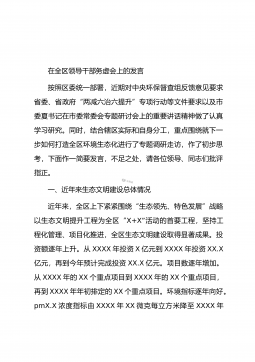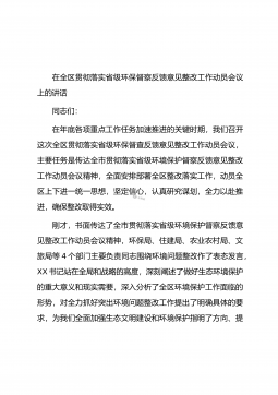 在全区贯彻落实省级环保督察反馈意见整改工作动员会议上的讲话同志们:在年底各项重点工作任务加速推进的关键时期,我们召开这次全区贯彻落实省级环保督查反馈意见整改工作动员会议,主要任务是传达全市贯彻落实省级环境保护督察反馈意见整改工作动员会议精神,全面安排部署全区整改落实工作,动员全区上下进一统一思想,坚定信心,认真研究谋划,全力以赴推进,确保整改取得实效。刚才,书面传达了全市贯彻落实省级环境保护督察反馈意见整改工作动员会议精神,环保局、住建局、农业农村局、文旅局等4个部门主要负责同志围绕环境问题整改作了表态发言,XX书记站在全局和战略的高度,深刻阐述了做好生态环境保护的重大意义和现实需要,深入分析...