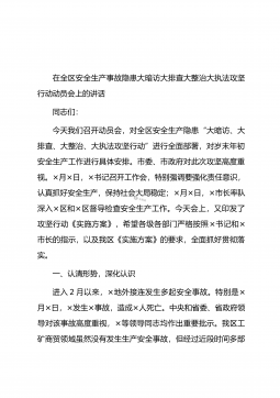 在全区安全生产事故隐患大暗访大排查大整治大执法攻坚行动动员会上的讲话同志们:今天我们召开动员会,对全区安全生产隐患“大暗访、大排查、大整治、大执法攻坚行动”进行全面部署,对岁末年初安全生产工作进行具体安排。市委、市政府对此次攻坚高度重视。×月×日,×书记召开工作会,特别强调要强化责任意识,认真抓好安全生产,保持社会大局稳定;×月×日,×市长率队深入×区和×区督导检查安全生产工作。今天会上,又印发了攻坚行动《实施方案》,希望各级各部门严格按照×书记和×市长的指示,以及我区《实施方案》的要求,全面抓好贯彻落实。一、认清形势,深化认识进入2月以来,×地外接连发生多起安全事故。特别是×月×日,×发生×...