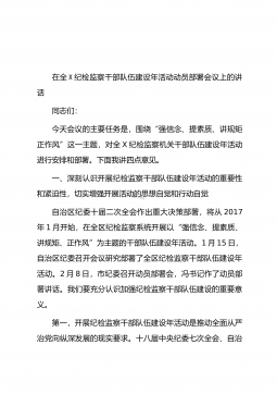 在全X纪检监察干部队伍建设年活动动员部署会议上的讲话同志们:今天会议的主要任务是,围绕“强信念、提素质、讲规矩正作风”这一主题,对全X纪检监察机关干部队伍建设年活动进行安排和部署。下面我讲四点意见。一、深刻认识开展纪检监察干部队伍建设年活动的重要性和紧迫性,切实增强开展活动的思想自觉和行动自觉自治区纪委十届二次全会作出重大决策部署,将从2017年1月开始,在全区纪检监察系统开展以“强信念、提素质、讲规矩、正作风”为主题的干部队伍建设年活动。1月15日,自治区纪委召开会议研究部署了全区纪检监察干部队伍建设年活动。2月8日,市纪委召开动员部署会,冯书记作了动员部署讲话。我们要充分认识加强纪检监察干...