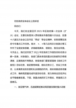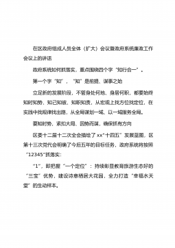 在区政府组成人员全体(扩大)会议暨政府系统廉政工作会议上的讲话政府系统如何抓落实,重点围绕四个字“知行合一”。第一个字“知”,“知”是前提、谋事之始立足新的发展阶段,不管身处何地、身居何职,都要始终知时知势、知己知彼、知职知责,从宏观上找方位找定位,在实践中找规律找出路,从全局谋划一域、以一域服务全局。要知时势,紧扣大局、因势而谋,确保抓有方向区委十二届十二次全会描绘了xx“十四五”发展蓝图,区第十三次党代会明确了今后五年的目标任务,政府系统将按照“12345”抓落实:“1”,即把握“一个定位”:持续彰显教育旅游生态好的“三宝”优势,建设诗意栖居大花园,全力打造“幸福水天堂”的生动样本。“2”...