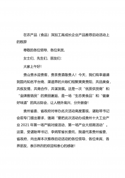 在农产品(食品)深加工高成长企业产品推荐启动活动上的致辞尊敬的各位领导、各位来宾,女士们、先生们、朋友们:大家上午好!贵山贵水迎贵客,贵茶贵酒敬贵人!今天,我们有幸邀请到国内知名平台商、渠道界的大咖们相聚爽爽贵阳,共品美食,共叙友情,共商合作,共谋发展。这是一次“优质供货商”和“金牌推销员”的美丽邂逅,是一场“生态美食品”和“健康好味道”的风云际会,让人格外高兴、分外振奋!贵州省委、省政府对举办此次活动高度重视,谌贻琴书记会前专门提出要求,强调“要把此次活动办成贵州十大工业产业2021年第一场产销对接活动、第一场产业大招商活动”。这里,受谌贻琴书记、李炳军省长委托,我谨代表贵州省委、省政府,向...