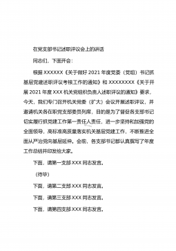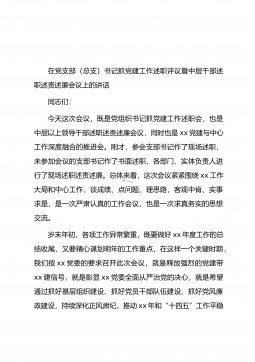 在党支部(总支)书记抓党建工作述职评议暨中层干部述职述责述廉会议上的讲话同志们:今天这次会议,既是党组织书记抓党建工作述职会,也是中层以上领导干部述职述责述廉会议,同时也是xx党建与中心工作深度融合的推进会。刚才,参会支部书记作了现场述职,未参加会议的支部书记作了书面述职,各部门、实体负责人进行了现场述职述责述廉。总体来看,这次会议紧紧围绕xx工作大局和中心工作,谈成绩、点问题、理思路,客观中肯、实事求是,是一次严肃认真的工作会议,也是一次求真务实的思想交流。岁末年初,各项工作异常繁重,既要做好xx年度工作的总结收尾,又要精心谋划明年的工作重点,在这样一个关键时期,我们按xx党委的要求召开此次...