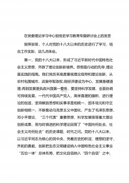 在党委理论学习中心组党史学习教育专题研讨会上的发言按照安排,个人对党的十八大以来的历史进行了学习,结合工作实际,谈几点体会。第一,党的十八大以来,形成了习近平新时代中国特色社会主义思想,开辟了理论创新新境界。思想是行动的先导,理论是实践的指南。我们党历来高度重视理论指导和理论创新,从农村包围城市,武装夺取政权;到经济建设为中心,发展是硬道理;再到发展是执政兴国第一要务,要坚持科学发展、全面协调可持续发展,一代代中国共产党人,高举真理的旗帜、进行理论的创造,坚持解放思想和实事求是相统一、固本培元和守正创新相统一,不断推动马克思主义中国化,产生了毛泽东思想、邓小平理论、“三个代表”重要思想、科学发...