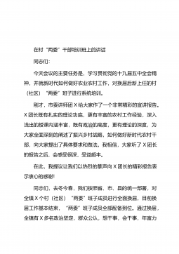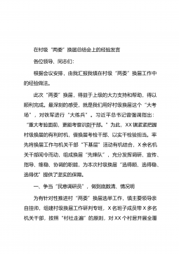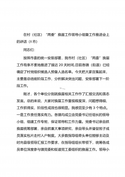 在村(社区)“两委”换届工作领导小组暨工作推进会上的讲话(X市)同志们:按照市委的统一安排部署,我市村(社区)“两委”换届工作有条不紊地推进了接近20天时间,目前各镇(街道)已经确定了村党组织候选人预备人选名单。今天把大家召集起来,主要是总结前阶段工作,分析解决突出问题,安排部署下一阶段工作。刚才,各个单位分别就换届相关工作作了汇报交流和表态发言。总的来说,大家对换届工作重视程度深,问题想得细、工作抓得实,阶段性成效也很明显。我感觉至少有3个特点。一是工作责任落实有力。各镇均成立由党委书记任组长的领导小组,组建工作专班,保证领导和工作力量。党委书记亲自抓换届统筹部署,亲自抓重大事项研究,亲自带...