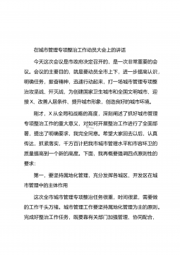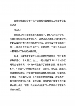 在城市管理综合考评点评会暨城市管理重点工作部署会上的讲话同志们:在全区工作非常紧张繁忙的情况下,我们今天召开会议,专题研究和推进城市管理工作,这足以说明此项工作的重要性,也足以表明区委区政府的态度和决心。这次会议主要有两项任务:一是总结点评2020年工作,兑现奖惩;二是对今年的城市管理重点工作进行安排部署。刚才,大家观看了第三方暗访发现的问题图片,可以说现状触目惊心、令人堪忧。会上,×同志通报了2020年城市管理综合考评情况,对×和×街道进行了表彰和奖励,区水务局和×、×街道作了很好的表态发言,决心大、信心足、措施实,关键要抓好落实。对于刚才的情况通报和表彰奖励,希望同志们要有一个正确的认知,...
