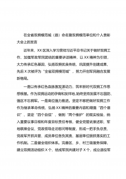 在全省双拥模范城(县)命名暨双拥模范单位和个人表彰大会上的发言近年来,XX区深入学习贯彻习近平总书记关于做好双拥工作、加强军政军民团结的重要讲话精神,以XX精神为引领,大力传承红色基因,弘扬双拥优良传统,巩固提升创建成果,先后X次被评为“全省双拥模范城”,努力开创军民融合发展新格局。一是以传承红色血脉激发源动力,筑牢新时代双拥工作思想根基。作为双拥运动的孕育和发祥地,始终坚持发展不忘国防、强区不忘拥军。一是高位强力推进。坚定不移把做好双拥工作作为继承革命传统、弘扬XX精神的重要内容和增强“四个意识”、坚定“四个自信”、做到“两个维护”的现实检验,纳入重要议事日程和年度目标责任考核,健全党管武装...