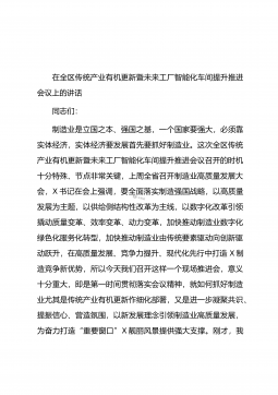 在全区传统产业有机更新暨未来工厂智能化车间提升推进会议上的讲话同志们:制造业是立国之本、强国之基,一个国家要强大,必须靠实体经济,实体经济要发展首先要抓好制造业。这次全区传统产业有机更新暨未来工厂智能化车间提升推进会议召开的时机十分特殊、节点非常关键,上周全省召开制造业高质量发展大会,X书记在会上强调,要全面落实制造强国战略,以高质量发展为主题,以供给侧结构性改革为主线,以数字化改革引领撬动质量变革、效率变革、动力变革,加快推动制造业数字化绿色化服务化转型,加快推动制造业由传统要素驱动向创新驱动跃升,在高质量发展、竞争力提升、现代化先行中打造X制造竞争新优势,所以今天我们召开这样一个现场推进会...
