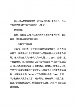 在XX镇人民代表大会第一次会议上的政府工作报告(五年工作总结及今后五年工作计划)(镇乡)各位代表:现在,我代表xx镇人民政府向大会作政府工作报告,请予审议。请列席会议同志提出意见。一、五年来工作回顾五年来,在区委、区政府和镇委的坚强领导下,在人大的监督下,我镇坚持以习近平新时代中国特色社会主义思想为指导,深入贯彻落实党的十九大和十九届二中、三中、四中、五中全会精神,深入贯彻落实习近平总书记出席xx经济特区建立xx周年庆祝大会和视察xx重要讲话、重要指示精神以及习近平总书记在庆祝中国共产党成立xxx周年大会上的重要讲话精神,全面落实省委“x+x+x”工作部署和市委“xxxx”工程,以乡村振兴发展...