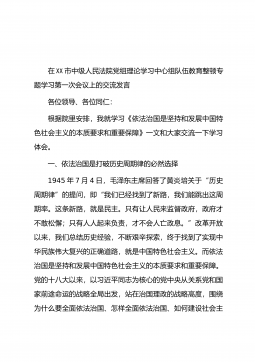 在XX市中级人民法院党组理论学习中心组队伍教育整顿专题学习第一次会议上的交流发言各位领导、各位同仁:根据院里安排,我就学习《依法治国是坚持和发展中国特色社会主义的本质要求和重要保障》一文和大家交流一下学习体会。一、依法治国是打破历史周期律的必然选择1945年7月4日,毛泽东主席回答了黄炎培关于“历史周期律”的提问,即“我们已经找到了新路,我们能跳出这周期率。这条新路,就是民主。只有让人民来监督政府,政府才不敢松懈;只有人人起来负责,才不会人亡政息。”改革开放以来,我们总结历史经验,不断艰辛探索,终于找到了实现中华民族伟大复兴的正确道路,就是中国特色社会主义。而依法治国是坚持和发展中国特色社会主...