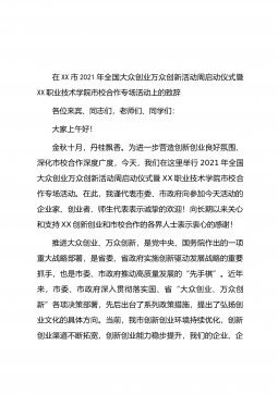 在XX市2021年全国大众创业万众创新活动周启动仪式暨XX职业技术学院市校合作专场活动上的致辞各位来宾、同志们,老师们、同学们:大家上午好!金秋十月,丹桂飘香。为进一步营造创新创业良好氛围、深化市校合作深度广度,今天,我们在这里举行2021年全国大众创业万众创新活动周启动仪式暨XX职业技术学院市校合作专场活动。在此,我谨代表市委、市政府向参加今天活动的企业家、创业者、师生代表表示诚挚的欢迎!向长期以来关心和支持XX创新创业和市校合作的各界人士表示衷心的感谢!推进大众创业、万众创新,是党中央、国务院作出的一项重大战略部署,是省委、省政府实施创新驱动发展战略的重要抓手,也是市委、市政府推动高质量发...