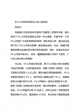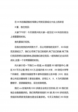 在XX科技集团股份有限公司党支部成立大会上的讲话X董、各位党员:大家下午好!今天很高兴和大家一起见证XX科技在政治上很重要的时刻。首先要表示祝贺。在各位党员的共同努力下,在公司领导的支持下,XX科技党支部成立了,我们公司有了自己的组织,有了自己的家,有了我们党员思想交流的阵地,团结我们各位党员,一起和我们企业共同成长,这是一个非常重要的时刻。向大家介绍一下我们xx街道,xx街道是XX城市副中心,辖区XX平方公里,常住XX万,区域内有XX大学、XX财经大学等7所高校,创智天地园区等8家科技园区以及中国(XX)创业者公共实训基地等2家创业基地,还有以X、X、X为代表的商圈楼宇,资源禀赋突出,区位优...
