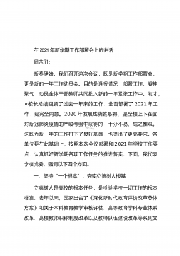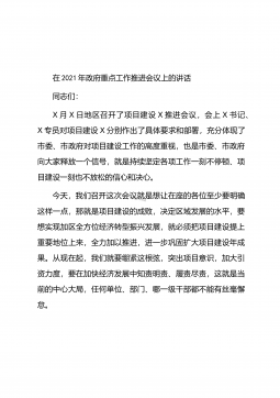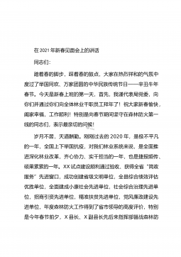 在2021年县政府第一次全体会议上的讲话同志们:刚才,各位副县长安排部署了分管工作,讲得很具体、很到位,请各镇办、各部门、各单位认真抓好贯彻落实;×镇、×镇、发改局、审批局、招商服务中心五个单位分别结合各自工作实际,作了很好的发言,大家要相互学习、相互借鉴,以求真务实的工作作风扎实推进各项重点工作,确保高质量完成年度目标任务。过去的一年,面对突如其来的新冠肺炎疫情和严峻复杂的发展形势,在县委的坚强领导下,在县人大、县政协的监督支持下,县政府深入学习贯彻习近平总书记来陕考察重要讲话精神,认真落实“六稳”“六保”工作部署要求,在取得疫情防控重大战果的同时,脱贫攻坚战夺取全面胜利,经济运行趋稳回暖,...