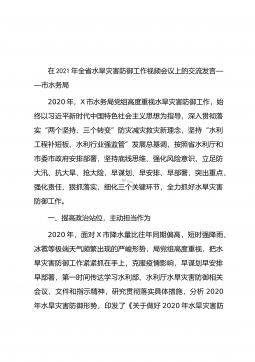 在2021年全省水旱灾害防御工作视频会议上的交流发言——市水务局2020年,X市水务局党组高度重视水旱灾害防御工作,始终以习近平新时代中国特色社会主义思想为指导,深入贯彻落实“两个坚持、三个转变”防灾减灾救灾新理念,坚持“水利工程补短板、水利行业强监管”发展总基调,按照省水利厅和市委市政府安排部署,坚持底线思维、强化风险意识,立足防大汛、抗大旱、抢大险,早谋划、早安排、早部署,突出重点、强化责任、狠抓落实,细化三个关键环节,全力抓好水旱灾害防御工作。一、提高政治站位,主动担当作为2020年,面对X市降水量比往年同期偏高,短时强降雨、冰雹等极端天气频繁出现的严峻形势,局党组高度重视,把水旱灾害防...