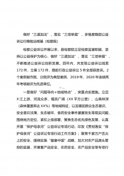 做好“三道加法”,落实“三项举措”,多维度稳固公益诉讼行稳致远根基(检察院)检察公益诉讼开展以来,县检察院立足检察监督职能,坚持以公益保护为核心,做好“三道加法”,落实“三项举措”,不断推进公益诉讼创新发展。四年内,共发现公益诉讼线索172件,立案172件,提起行政公益诉讼5件全部获胜诉。2个案例被市院、分院评为典型案例,2019年、2020年连续两年考核被评为先进单位。一是做好“问题导向+地域特点”,突重点实措施。立足X江上游、河流众多、幅员广阔(XX平方公里)、山高林深(森林覆盖率达XX%)等地域特征,以及辖区群众生态意识、安全意识淡薄,生态破坏、食药安全事件屡屡发生等现实问题,围绕地方定...