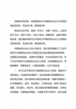 专题读书班发言:始终做新时代中国特色社会主义思想的坚定信仰者、忠实执行者、模范践行者参加这次读书班,既是一次学习,也是一次洗礼,让我学到了方法、学定了信念、学出了担当。根据安排,由我代表班级发言,题目是始终做习近平新时代中国特色社会主义思想的坚定信仰者、忠实执行者、模范践行者。中国特色社会主义进入新时代,我们党牢固确立了习近平新时代中国特色社会主义思想为党必须长期坚持的指导思想,这既是历史的选择,也是时代的要求。作为党员领导干部,学习习近平新时代中国特色社会主义思想,必须带着信念学、带着感情学、带着使命学,以真信求真知、以实干促实绩。一、学习习近平新时代中国特色社会主义思想,基础在于坚定信仰,...