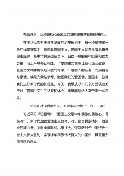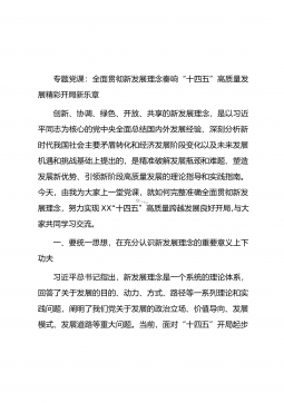 专题党课:全面贯彻新发展理念奏响“十四五”高质量发展精彩开局新乐章创新、协调、绿色、开放、共享的新发展理念,是以习近平同志为核心的党中央全面总结国内外发展经验、深刻分析新时代我国社会主要矛盾转化和经济发展阶段变化以及未来发展机遇和挑战基础上提出的,是精准破解发展瓶颈和难题、塑造发展新优势、引领新阶段高质量发展的理论指导和实践指南。今天,由我为大家上一堂党课,就如何完整准确全面贯彻新发展理念,努力实现XX“十四五”高质量跨越发展良好开局,与大家共同学习交流。一、要统一思想,在充分认识新发展理念的重要意义上下功夫习近平总书记指出,新发展理念是一个系统的理论体系,回答了关于发展的目的、动力、方式、路...