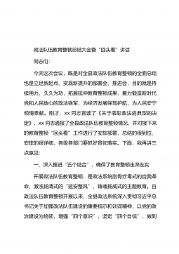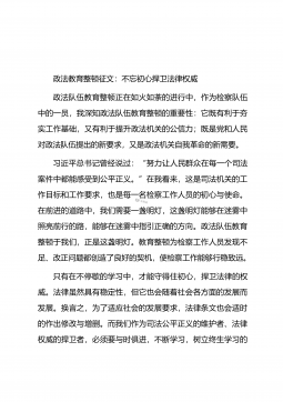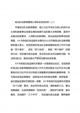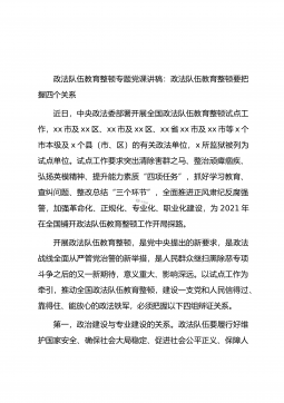 政法队伍教育整顿专题党课讲稿:政法队伍教育整顿要把握四个关系近日,中央政法委部署开展全国政法队伍教育整顿试点工作,xx市及xx区、xx市及xx区、xx省xx市及xx市等x个市本级及x个县(市、区)的有关政法单位,x所监狱被列为试点单位。试点工作要求突出清除害群之马、整治顽瘴痼疾、弘扬英模精神、提升能力素质“四项任务”,抓好学习教育、查纠问题、整改总结“三个环节”,全面推进正风肃纪反腐强警,加强革命化、正规化、专业化、职业化建设,为2021年在全国铺开政法队伍教育整顿工作开局探路。开展政法队伍教育整顿,是党中央提出的新要求,是政法战线全面从严管党治警的新举措,是人民群众继扫黑除恶专项斗争之后的又...