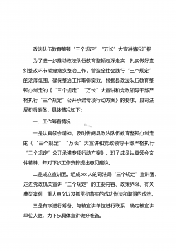 政法队伍教育整顿“三个规定”“万长”大宣讲情况汇报为了进一步推动政法队伍教育整顿走深走实,扎实做好查纠整改环节顽瘴痼疾整治工作,营造全社会践行“三个规定”的浓厚氛围,确保整治工作取得实效,根据县政法队伍教育整顿办制定的《“三个规定”“万长”大宣讲和党政领导干部严格执行“三个规定”公开承诺专项行动方案》的要求,县司法局积极筹备,具体情况如下:一、工作筹备情况一是认真领会精神。及时传阅县政法队伍教育整顿办制定的《“三个规定”“万长”大宣讲和党政领导干部严格执行“三个规定”公开承诺专项行动方案》,班子成员认真领会文件精神,并对下步工作安排提出意见建议。二是成立宣讲团。组成xx人的司法局“三个规定”宣...