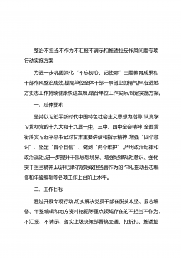 整治不担当不作为不汇报不请示和推诿扯皮作风问题专项行动实施方案为进一步巩固深化“不忘初心、记使命”主题教育成果和干部作风整治成效,提高单位全体干部干事创业的精气神,促进地方史志工作持续健康快速发展,结合单位工作实际,制定实施方案。一、总体要求坚持以习近平新时代中国特色社会主义思想为指导,认真学习贯彻党的十九大和十九届一中、三中、四中全会精神,全面贯衔落实习近平总书记对甘肃重要讲话和指示精神,增强“四个意识”、坚定“四个自信”、做到“两个维护”,严明政治纪律和政治规矩,进一步提升干部思想境界、增强纪律规矩意识、强化实干担当精神,以讲纪律守规矩敢担当善作为的作风,推动县志编修和年鉴编辑等各项工作上...