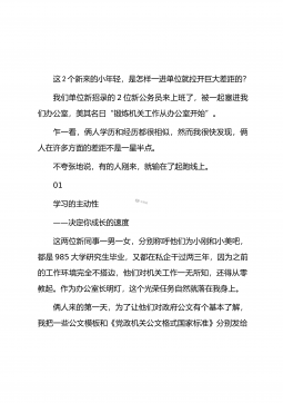 这2个新来的小年轻,是怎样一进单位就拉开巨大差距的?我们单位新招录的2位新公务员来上班了,被一起塞进我们办公室,美其名曰“锻炼机关工作从办公室开始”。乍一看,俩人学历和经历都很相似,然而我很快发现,俩人在许多方面的差距不是一星半点。不夸张地说,有的人刚来,就输在了起跑线上。01学习的主动性——决定你成长的速度这两位新同事一男一女,分别称呼他们为小刚和小美吧,都是985大学研究生毕业,又都在私企干过两三年,因为之前的工作环境完全不搭边,他们对机关工作一无所知,还得从零教起。作为办公室长明灯,这个光荣任务自然就落在我身上。俩人来的第一天,为了让他们对政府公文有个基本了解,我把一些公文模板和《党政机...