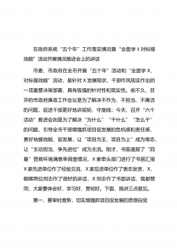 在政府系统“五个年”工作落实情况暨“全面学X对标提效能”活动开展情况推进会上的讲话市委、市政府在全市开展“五个年”活动和“全面学X、对标提效能”活动,是针对X发展现状、干部作风现实作出的一项重要决策部署,具有极强的针对性和现实性。前不久,召开的市政府廉政工作会议是为了解决不作为、不担当、不廉洁的问题,促进干部更好地讲规矩、守底线;今天,召开“六个活动”推进会则是为了解决“为什么”“干什么”“怎么干”的问题,引导全市干部增强抓项目促发展的危机感和责任感,更好地提效能、促发展,让“项目为王、项目为上”成为常态,让“主动担当、争先进位”成为主流。刚才,书面通报了“四最”营商环境满意率调查情况,X家牵...