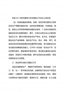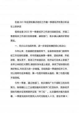 在县2021年投资和重点项目工作暨一季度经济形势分析会议上的讲话现将全县2021年一季度经济工作进行回顾总结,并就二季度相关工作进行安排部署,请各部门、各乡镇认真抓好贯彻落实。一、充分认识当前形势,进一步坚定发展的信心和决心今年以来,在县委的坚强领导下,全县各级各部门按照年初工作安排和部署,牢牢把握发展第一要务,团结拼搏,开拓进取,埋头苦干,各项工作快速启动,经济运行总体上承接了去年以来的巨大惯性,继续在快车道上前进,保持了较快增长的良好势头,内在活力进一步增强。总结我县一季度的经济工作,可以用两句话来概括:第一句是开局势头强劲;第二句是问题不容忽视。今年一季度,通过各部门、各乡镇和广大干部职...