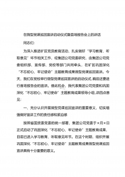 在微型党课巡回宣讲启动仪式暨首场报告会上的讲话同志们:为深入推进矿区党员教育活动,扎实做好“学习教育、听取意见”环节相关工作,经集团公司党委研究,由集团公司党委组织部、宣传部、党校等部门共同牵头,在矿区巩固深化“不忘初心、牢记使命”主题教育成果微型党课巡回宣讲。今天,我们在党校举行微型党课巡回宣讲的启动仪式,稍后还要进行首场报告会的宣讲。借此机会,我代表集团公司党委和巩固深化“不忘初心、牢记使命”主题教育成果领导小组,讲四点意见:一、充分认识开展微型党课巡回宣讲的重要意义,切实增强做好宣讲工作的责任感和紧迫感按照省国资委党委的统一部署,集团公司党委于×月×日正式启动了巩固深化“不忘初心、牢记使...