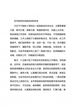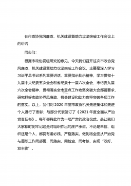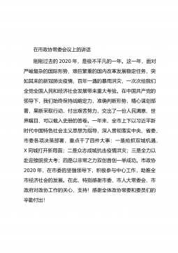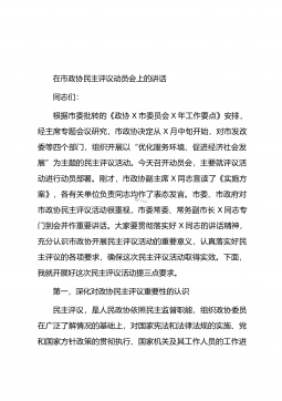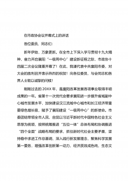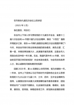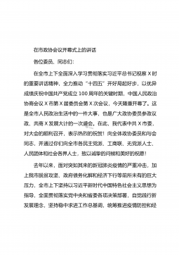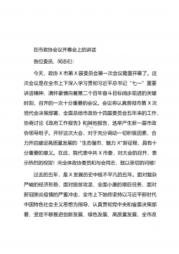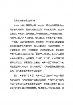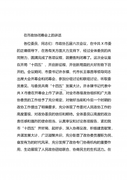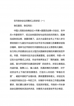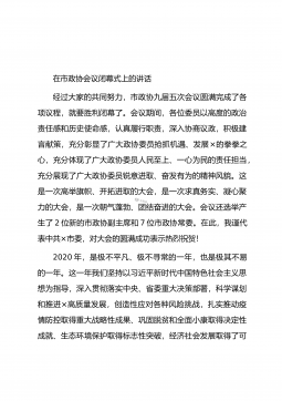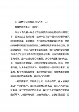 在市政协会议闭幕式上的讲话(二)尊敬的各位委员、同志们:政协X市九届一次会议在全体委员和与会同志的共同努力下,圆满完成了各项议程,选举产生了新一届市政协领导班子,即将胜利闭幕。会议期间,各位委员以饱满的政治热情、昂扬的精神状态和强烈的责任担当,认真履行职责,积极参政议政,踊跃建言献策,体现了政协委员心系发展、胸怀大局的使命与情怀,彰显了社会主义协商民主的优势与活力。会议开得隆重热烈、富有成效,是一次坚定信心谋发展、齐心协力促和谐的大会,是一次发扬民主聚共识、加强团结鼓实劲的大会。在此,我代表市委,对大会的圆满成功,对当选的新一届市政协主席、副主席、秘书长和各位常委,表示热烈的祝贺!对全体政协委...