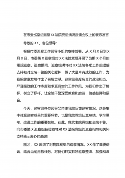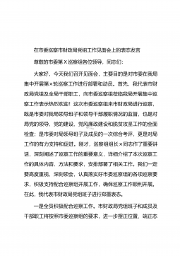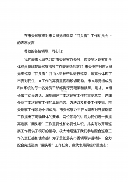 在市委巡察组对市X局党组巡察“回头看”工作动员会上的表态发言尊敬的各位领导,同志们:我代表市×局党组对市委巡察办领导、市委第×巡察组全体成员莅临我局巡察指导工作表示热烈欢迎!市委决定对市×局党组巡察“回头看”并由×组长带队进行巡察,这充分体现了市委对民生、×工作的高度重视和殷切期盼。市×局党组成员和×系统的每一名党员干部都将深受鞭策和鼓舞。刚才,×组长做了动员讲话,深刻阐述了本次巡察工作的重要意义,详细介绍了本次巡察工作的具体内容、方法以及相关工作安排,市委巡察工作领导小组成员、市委巡察办主任×同志对开展巡察工作提出了明确具体的要求。两位领导的讲话为我们进一步提高巡察“回头看”工作重要性和必要...