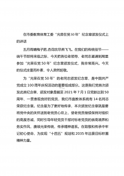 在市委教育体育工委“光荣在党50年”纪念章颁发仪式上的讲话五月雨晴梅子肥,杏花吹尽燕飞飞。在我们的传统佳节——端午节即将来临之际,今天把各位老领导、老同志邀请到局里参加“光荣在党50年”纪念章颁发仪式,我非常高兴。今天的仪式庄重而朴素,令人肃然起敬。为“光荣在党50年”的老同志颁发纪念章,是中国共产党成立100周年庆祝活动的重要组成部分。这是我们党首次颁发此类纪念章,颁发对象是截至2021年7月1日党龄达到50周年、一贯表现良好的党员,我们市直教体系统有14名同志荣获纪念章。纪念是为了更好地传承,本次颁发纪念章就是要将党中央的关怀送到老党员心坎上,使老党员继续保持对组织的高度忠诚,同时引导年轻...