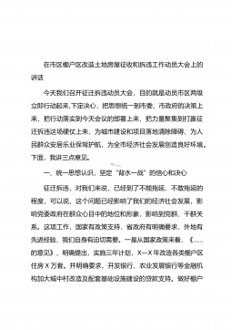 在市区棚户区改造土地房屋征收和拆违工作动员大会上的讲话今天我们召开征迁拆违动员大会,目的就是动员市区两级立即行动起来,下定决心,把思想统一到市委、市政府的决策上来,把行动落实到今天会议的部署上来,把力量聚集到打赢征迁拆违这场硬仗上来,为城市建设和项目落地清除障碍、为人民群众安居乐业保驾护航,为全市经济社会发展创造良好环境。下面,我讲三点意见。一、统一思想认识,坚定“背水一战”的信心和决心征迁拆违,对我们来说,已经到了不能拖延、不敢拖延的程度,可以说,这个问题已经影响了我们的经济社会发展,影响党委政府在群众心目中的地位和形象,影响到党群、干群关系。这项工作,国家有政策支持,省政府有明确要求,外地...