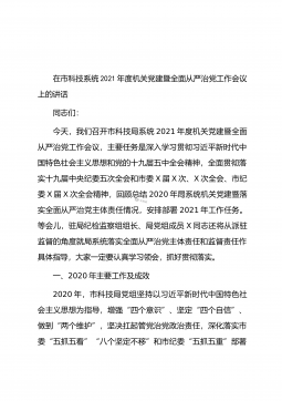 在市科技局系统2021年度机关党建暨全面从严治党工作会议上的讲话同志们:今天,我们召开市科技局系统2021年度机关党建暨全面从严治党工作会议,主要任务是深入学习贯彻习近平新时代中国特色社会主义思想和党的十九届五中全会精神,全面贯彻落实十九届中央纪委五次全会和市委X届X次、X次全会、市纪委X届X次全会精神,回顾总结2020年局系统机关党建暨落实全面从严治党主体责任情况,安排部署2021年工作任务。等会儿,驻局纪检监察组组长、局党组成员X同志还将从派驻监督的角度就局系统落实全面从严治党主体责任和监督责任作具体指导,大家一定要认真学习领会,抓好贯彻落实。一、2020年主要工作及成效2020年,市科技...