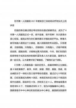 在市第一人民医院2021年度新员工岗前培训开班仪式上的讲话在座的各位通过理论考试和综合面试脱颖而出,成为了X市第一人民医院正式一员,很不容易,很不简单!向大家表示衷心祝贺。医院必将为你们提供展示才能的良好平台。希望大家尽快融入医院这个大家庭,融入到医院的专业团队。只有理解,才能相融。只有融入,才能相知;只有融入,才能不断挑战自我,超越自我,才能做出更大的成绩。今天,我们在院的院领导班子成员及相关职能科室负责人与大家见面,是想与大家一起交流。让大家更好地了解医院,了解我们这个团队。X市第一人民医院是一座历史悠久、底蕴深厚的公立医院,是X地区集医疗、教学、科研、保健、预防、康复、急救、职业病防治于...