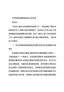在市财政局调研座谈会上的讲话同志们:今天和×副市长来调研的目的有三个:一是全面的了解全市的财政状况;二是跟大家共同商量下一步财政工作怎么做;三是加快推进目前急需解决的问题。刚才×局长汇报了全市的财政工作,×副市长提出了明确要求,请大家认真抓好落实。下面,我讲三点意见:一、充分发挥财政的职能作用,强化在经济社会发展的中枢地位在成熟的市场经济国家,调控经济的主要职能部门有两个,一个是财政部门,一个是央行。在宏观经济调控中,财政政策和货币政策是主要的手段,全球各主要经济体通过财长会议、央行行长会议,定期会面、沟通交流,推动财政政策、货币政策之间相互协调,达到两个方面的政策共同发力、共同解决世界范围内...