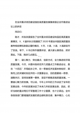 在全州重点项目建设园区高质量发展暨政银企合作推进会议上的讲话同志们:刚才,州发改委报告了全州重点项目建设和园区高质量发展情况,X、X副州长分别通报了2020年度全州园区高质量发展考核结果和政银企履约情况,X市、X县、X县、X高新区作了发言。等下,X书记将作重要讲话,请大家认真领会,抓好落实。下面,我讲几点意见。第一,凝心聚力、突出重点、创新方式,全力推进经济高质量发展。今天,州委州政府召开几项重点工作推进会议,是在“十四五”开局起步之年,在一季度经济发展来势较好,乘势而上的关键时刻召开的一次重要会议,目的是要统一思想,凝聚共识,坚持发展第一要务,坚定不移推进高质量发展。一要凝心聚力抓发展。可以...
