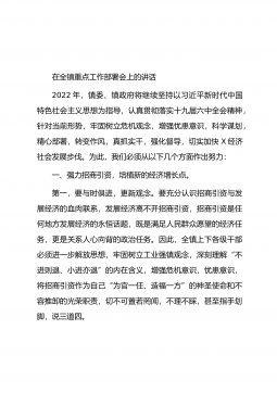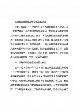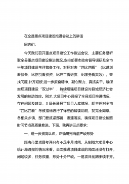 在全县重点项目建设推进会议上的讲话同志们:今天我们召开重点项目建设工作推进会议,主要任务是听取全县重点项目建设推进情况,安排部署市政府督导调研及全市半年项目建设考评筹备工作,对标对表“四比四看”(比谋划看储备、比招引看投资、比开工看进度、比服务看实效),查找问题,补齐短板,进一步振奋精神、凝心聚力、真抓实干,确保实现项目建设“双过半”,持续增强项目建设对县域经济社会发展的拉动效应。刚才,大项目中心通报了全县项目推进情况、存在问题及建议,X局长通报了项目入库情况,胡主任对全市“四比四看”考核指标进行了详细的解读说明,我完全同意。各相关乡镇、部门要抓紧部署,迅速落实,确保项目建设按照时间节点高质量...