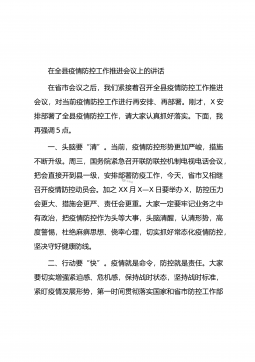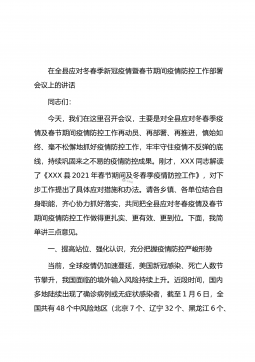 在全县应对冬春季新冠疫情暨春节期间疫情防控工作部署会议上的讲话同志们:今天,我们在这里召开会议,主要是对全县应对冬春季疫情及春节期间疫情防控工作再动员、再部署、再推进,慎始如终、毫不松懈地抓好疫情防控工作,牢牢守住疫情不反弹的底线,持续巩固来之不易的疫情防控成果。刚才,XXX同志解读了《XXX县2021年春节期间及冬春季疫情防控工作》,对下步工作提出了具体应对措施和办法。请各乡镇、各单位结合自身职能,齐心协力抓好落实,共同把全县应对冬春疫情及春节期间疫情防控工作做得更扎实、更有效、更到位。下面,我简单讲三点意见。一、提高站位、强化认识,充分把握疫情防控严峻形势当前,全球疫情仍加速蔓延,美国新冠...