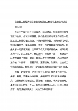 在全县工业经济项目建设招商引资工作会议上的主持讲话同志们:今天下午我们召开工业经济、项目建设、招商引资三项专项工作会议,会议非常重要。我们是把三项专项工作揉在一起,这三项工作看似相互独立,不同的领导分管,不同的部门牵头。我们分解任务,拿具体举措、考核,也好像是单列的体系。但是大家一定要看清楚,这三项工作实际是紧密相关、相互作用、互为一体。这三项工作,我说是叫“形散神不算”,都统领于经济发展这个范畴,实际上都是经济工作的范畴,而且是经济工作的“牛鼻子”、重要手段、重要任务。如果说,这三项工作我们有疏忽、抓得不好,罗田的经济就会出问题一点不为过。大家一定要看到,经济工作什么地位?经济工作是中心,是...