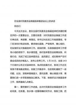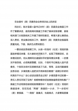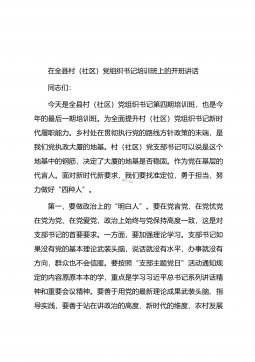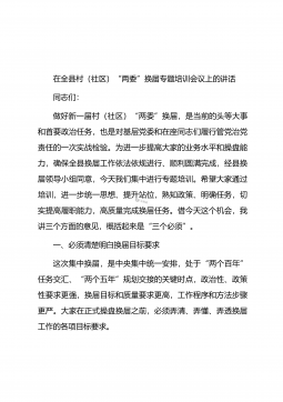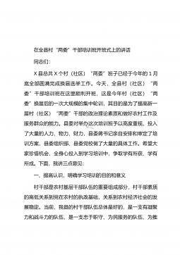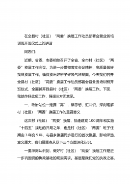 在全县村(社区)“两委”换届工作动员部署会暨业务培训班开班仪式上的讲话同志们:近期,省委、市委相继召开了全省、全市村(社区)“两委”换届工作会议,为进一步贯彻落实会议精神,高质量做好我县换届工作,确保换出好班子好风气好局面,今天我们召开全县村(社区)“两委”换届工作动员部署会暨业务培训班开班仪式,全面铺开我县村(社区)“两委”换届工作。下面,我就作好此项工作,强调三方面意见。一、政治站位一定要“高”,聚思想、汇共识,深刻理解村(社区)“两委”换届工作的重要意义这次村(社区)“两委”换届,恰逢建党100周年和实施“十四五”规划的开局之年,也是村(社区)“两委”班子任期由3年变5年,与县乡换届同步...