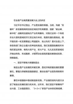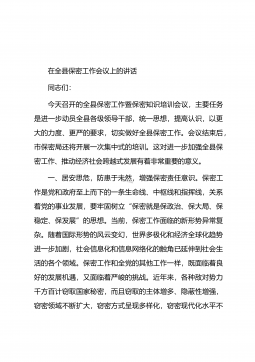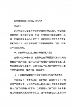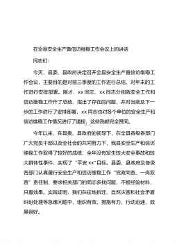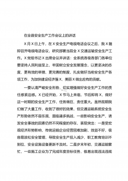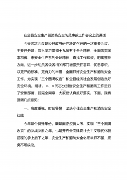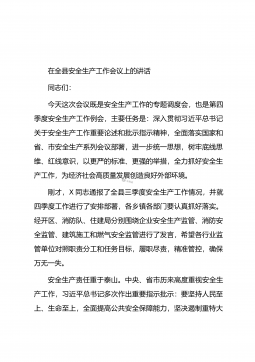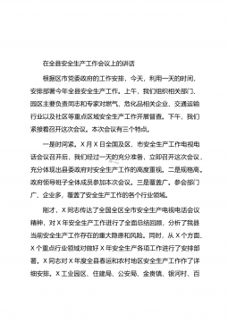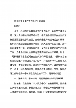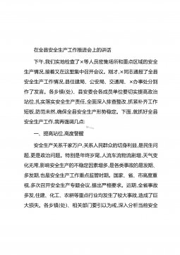 在全县安全生产工作推进会上的讲话下午,我们实地检查了×等人员密集场所和重点区域的安全生产情况,接着又在这里集中召开会议。刚才,×同志通报了全县安全生产工作情况,县住建局、公安局、交通局、×办事处分别作了发言。各乡镇(处)、县安委会各成员单位要切实提高政治站位,扎实落实安全生产责任,全面深入排查整改,抓紧补齐工作短板,防范未然,确保全县安全生产形势稳定。下面,就抓好全县安全生产工作,我再强调几点:一、提高站位,高度警醒安全生产关系千家万户,关系人民群众的切身利益,是民生问题,更是政治问题。特别是年终岁尾,人流车流物流剧增,天气变化无常,影响安全生产的不稳定因素增多,是各类事故的易发期、多发期,也...