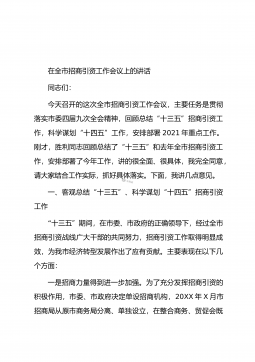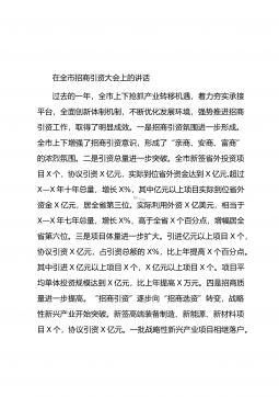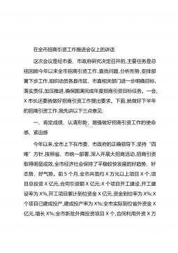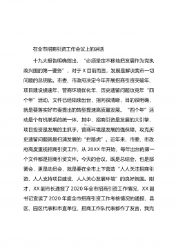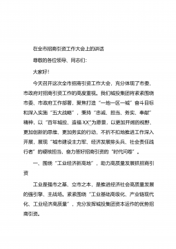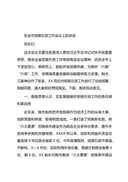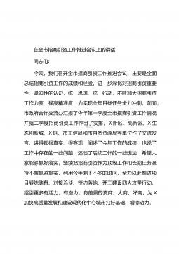 在全市招商引资工作推进会议上的讲话这次会议是经市委、市政府研究决定召开的,主要任务是总结回顾今年以来全市招商引资工作,查找问题,分析形势,安排部署下步工作,组织动员各县市区、市直相关部门进一步明确目标,落实责任,加压推进,确保圆满完成年度招商引资目标任务。一会,X市长还要就做好招商引资工作提出要求。下面,就做好下半年的招商引资工作,我先讲以下三点意见:一、肯定成绩、认清形势,增强做好招商引资工作的使命感、紧迫感今年以来,全市上下在市委、市政府的正确领导下,坚持“四唯”方针,按照省、市统一部署,深入开展大招商活动,招商引资取得明显成效,全市经济社会保持了平稳较快发展的好趋势、好态势、好气势。前5...