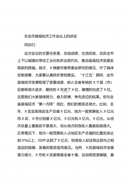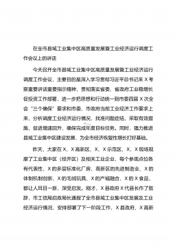在全市县域工业集中区高质量发展暨工业经济运行调度工作会议上的讲话今天召开全市县域工业集中区高质量发展暨工业经济运行调度工作会议,主要目的是深入学习贯彻习近平总书记来X考察重要讲话重要指示精神,贯彻落实省委、省政府工业稳增长促投资工作部署,进一步把思想和行动统一到市委四届X次全会“三个确保”要求和市委、市政府当前工业经济工作要求上来,分析调度工业经济运行情况,找准问题症结,采取有效措施,促进增速回升,确保完成年度目标任务。同时,强力推进县域工业集中区建设发展,为全市经济恢复性增长打好基础。昨天,大家在X、X高新区、X、X示范区、X、X现场观摩了工业集中区(经开区)及相关工业企业,每个参观点位各有...