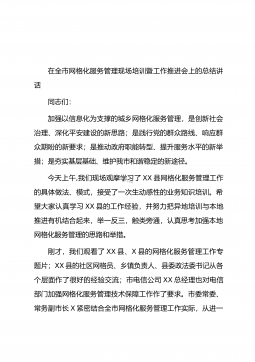 在全市网格化服务管理现场培训暨工作推进会上的总结讲话同志们:加强以信息化为支撑的城乡网格化服务管理,是创新社会治理、深化平安建设的新思路;是践行党的群众路线、响应群众期盼的新要求;是推动政府职能转型、提升服务水平的新举措;是夯实基层基础、维护我市和谐稳定的新途径。今天上午,我们现场观摩学习了XX县网格化服务管理工作的具体做法、模式,接受了一次生动感性的业务知识培训。希望大家认真学习XX县的工作经验,并努力把异地培训与本地推进有机结合起来,举一反三,触类旁通,认真思考加强本地网格化服务管理的思路和举措。刚才,我们观看了XX县、X县的网格化服务管理工作专题片;XX县的社区网格员、乡镇负责人、县委政...