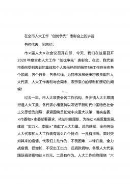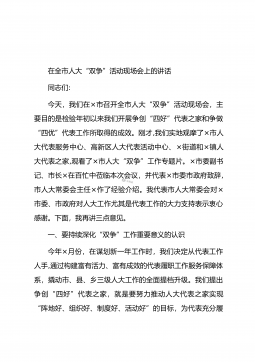 在全市人大“双争”活动现场会上的讲话同志们:今天,我们在×市召开全市人大“双争”活动现场会,主要目的是检验年初以来我们开展争创“四好”代表之家和争做“四优”代表工作所取得的成效。刚才,我们实地观摩了×市人大代表服务中心、高新区人大代表活动中心、×街道和×镇人大代表之家,观看了×市人大“双争”工作专题片。×市委副书记、市长×在百忙中莅临本次会议,并代表×市委市政府致辞,市人大常委会主任×作了经验介绍。我代表市人大常委会对×市委、市政府对人大工作尤其是代表工作的大力支持表示衷心感谢。下面,我再讲三点意见。一、要持续深化“双争”工作重要意义的认识今年×月份,在谋划新一年工作时,我们决定从代表工作人手...