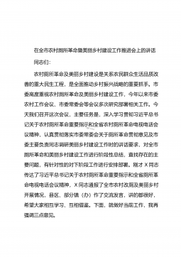 在全市农村厕所革命暨美丽乡村建设工作推进会上的讲话同志们:农村厕所革命及美丽乡村建设是关系农民群众生活品质改善的重大民生工程,是全面推动乡村振兴战略的重要抓手。市委高度重视农村厕所革命及美丽乡村建设工作,今年以来市委农村工作会议、市委常委会等会议多次研究部署相关工作。今天我们召开这次会议,主要任务是,深入学习贯彻习近平总书记关于农村厕所革命重要指示和全省农村厕所革命电视电话会议精神,认真贯彻落实市委常委会关于厕所革命贯彻意见及市委主要负责同志调研美丽乡村建设工作时的讲话要求,对全市厕所革命和美丽乡村建设工作进行阶段性总结,查找存在的主要问题,有针对性的对下阶段工作进行安排部署。刚才X同志传达了...