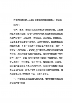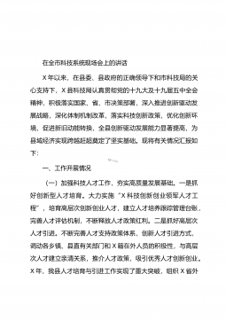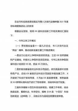在全市科技系统贯彻落实市第八次党代会精神暨2021年度目标调度推进会上的发言根据会议安排,现将XX县科技创新工作相关情况汇报如下:一、今年以来工作情况(一)贯彻落实省委十一届九次全会、市八次党代会及“两会”精神,推动创新发展主要工作推进情况一是全力以赴对上争取科技项目资金。立足XX自然禀赋和产业基础,积极对上争取科技项目资金,今年以来共争取到省科技计划项目XX项,资金XX万余元。二是积极创建省级农业科技示范园区。依托我县茶叶优势特色产业,启动XX省级农业科技示范园区申报创建工作,X月接受了科技厅现场考察,X月由XX县县委常委、常务副县长XX群带队到科技厅进行了现场答辩,目前待科技厅批复。三是科...